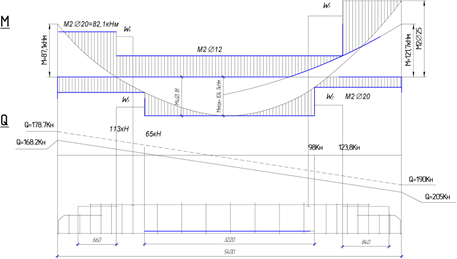 Рис. 4.1–Епюри моментів М та поперечної сили Q ригеля.