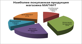 Рис.5 Продукция, приобретаемая в сети магазинов "Магнит". Из диаграммы на рисунке 5 видно, что наибольшим спросом пользуется молочная продукция. Это подтверждают и наблюдения, проведенные в магазинах. В процессе наблюдения было отмечено, что первой на полках магазинов заканчивается именно молочная продукция, что позволяет на следующий день выложить свежую, обеспечивая потребителя здоровой и свежей молочной продукцией. Мучная также пользуется спросом, что отвечает культурным традициям страны. Практически в каждой семье активно потребляется хлеб или иная мучная продукция. Бакалейные товары приобретают 13% респондентов, это объясняется тем, что в наше время нельзя обойтись без круп и бобовых и на них не слишком высокие цены. Так же был дан свой вариант ответа: фрукты, овощи, напитки, алкоголь, сигареты.