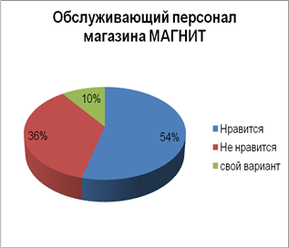 Рис.9 Обслуживающий персонал магазина "Магнит" Обслуживание является важной составляющей работы магазина. Из рис.8 мы видим, то, что 54% опрашиваемых нравится обслуживание в магазинах "Магнит".36% не устраивает обслуживание персонала, они считают, то, что продавцы-консультанты не достаточно вежливы, аккуратны и квалифицированны.10% покупателей отметили, что на кассах создаются большие очереди, это связано с тем, что не все кассиры находятся на рабочем месте. Это очень замедляет процесс расчета за покупки. В один из дней нашего наблюдения на улице Бертюльская 7 "А" мы стали свидетелями небольшого инцидента, пенсионерка, купившая картошку в магазине "Магнит", придя домой обнаружила, что она оказалась мороженной. Женщина расстроилась, что потратила деньги на некачественный товар и решила его обменять. На наше удивление администратор магазина "Магнит" без всяких вопросов забрала товар, отдала деньги и принесла свои извинения. Большинство респондентов считают, что сеть магазинов на рынке известная, так как эта сеть очень распространенная по всей России, пользуется спросом из за приемлемых цен, самообслуживания. Они считают, что сеть магазинов "Магнит" перспективная, так как уже во многих городах открываются семейные Гипермаркеты "Магнит". Но на вопрос является ли эта сеть лучшей, большинство опрошенных не согласны с этим утверждением, так как конкуренция постоянно растет.