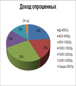 Рис.14 Род занятий опрошенных Из рис.14 следует, что 30% опрошенных рабочие, 29% указывали свой вариант ответа, в основном это были пенсионеры, домохозяйки.21% респондентов являлись менеджеры среднего звена,7% - студенты. Согласно опросу, большинство покупателей имеют средний доход, который составляет 6001-10000 р., это 26%, затем идут граждане доход которых ниже прожиточного минимума, до 4000 р., 18% опрошенных имеют достаток 4001-6000 р., имеющих доход 20001-30000 р. составило 2%, и свыше 30001 р. -1%. (рис.15)