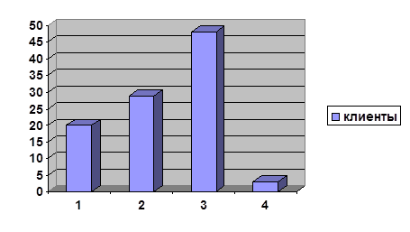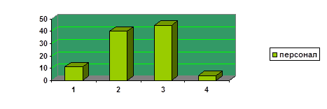 Рис. 9 - Стаж работы персонала 1 – до 1 года 2 – от 1 до 3 лет 3 – от 3 до 5 лет 4 – 5 и более лет Отсюда следует, что большинство сотрудников фирмы работают в данной организации от 1-5 лет (от 1 до 3лет – 40%, от 3 до 5 лет – 45%), при этом старожилами можно назвать только 4% (5 и более лет). Остальные 11% - являются новичками в данной фирме. Можно заключить, что коллектив ООО «Элекам» в принципе уже сложенная организация, с постоянным коллективом, в котором не наблюдаются такие явления, как текучесть кадров, непостоянство руководящего и обслуживающего персонала. При этом, по наблюдениям и беседе с персоналом выявилось то, что руководство большое внимание уделяет обучению и повышению квалификации всего персонала ООО «Элекам», в фирме возможен карьерный рост, в ней приветствуется активность и организованность, исполнительность и вежливость при работе с клиентом. Это непременно положительно влияет на всю деятельность фирмы, а именно на её имидж. Таким образом, коллектив ООО «Элекам» составляют в своём большинстве мужчины от 25 до 45 лет, многие из которых работают в данной фирме более 1 года. Самым главным критерием того, что имидж фирмы сложился и приносит свои плоды является мнение самого персонала. Именно они являются активными участниками данного процесса, так как по их внешнему виду, поведению и уровню, качеству обслуживания покупателей судят обо всей фирме. В данном случае, необходимо выявить сформированность имиджа торгового центра «Элекам». На вопрос: «Считаете ли Вы, что у ТЦ «Элекам» сформировался имидж?» был дан единодушный ответ всего персонала ООО «Элекам». Отсюда следует, что весь персонал считает, что имидж в фирме уже сформировался. При этом, на вопрос: «Считаете ли Вы, что образ ТЦ «Элекам» благоприятен восприятию клиента?» был также дан положительный ответ. Таким образом, Персонал «Элекам» считает, что их фирма имеет свой сформированный имидж, который благоприятно влияет на восприятие клиентов. На следующий вопрос: «Проводил ли ТЦ «Элекам» исследования, связанные с оценкой удовлетворённости клиентов качеством обслуживания?» были даны не менее важные для нашего исследования ответы.
