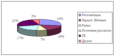 Рис. 5 - Предпочтения и посещаемость клиентами определённой фирмы по продаже бытовой аппаратуры, оборудования При обработке анкет было выявлено, что всё-таки 40% респондентов чаще всего посещают фирму «Элекам». 35% респондентов выбирают в качестве предпочитаемой фирмы «Эльдорадо». Следующая по значимости фирма «Бизнес-Центр» - его доля составляет 12%, за ним следует фирма «Ваш дом» (8%), остальные 5% выбрали «Александр ЛТД». Отсюда видно, что большинство респондентов отдали предпочтение фирме «Элекам» При этом, только в отношении данной фирмы были сказаны такие необходимые для имиджа слова, как «престижно», «авторитетно», «не стыдно сказать, что брал в «Элекам»». Отсюда следует, что благодаря своему завоеванному авторитету, «Элекам» лидирует среди себе подобных фирм. На следующий вопрос: «Из каких источников Вы узнали об этой фирме?» были даны следующие ответы.