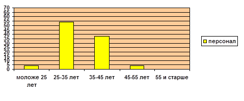 Рис. 8 - Диаграмма возрастных особенностей персонала Также основной причиной предпочтения мужчин в качестве сотрудников, может быть создание определённого имиджа «мужской фирмы», «мужской компании» и т.д. При этом, не менее интересные результаты были получены по выявлению возрастных особенностей персонала фирмы. Отсюда следует, что большинство сотрудников фирмы имеют возраст от 25 до 45 лет (от 25 до 35 лет – 54%, от 35 до 45 лет – 38%), то есть являются достаточно молодыми и энергичными людьми. При этом, обслуживающий персонал достаточно молодого возраста (до 35 лет), люди постарше занимают более высокие должности. Конечно, выбор молодых и активных людей достаточно очевиден, так как это одна из составляющих имиджа («Молодые сотрудники более исполнительные и коммуникабельны», «Молодые сотрудники более привлекательны для посетителей», «Молодое лицо фирмы» и т.д. Таким образом, можно сделать вывод, что персонал фирмы достаточно молодой, при этом преобладающее большинство составляют мужчины. Стаж работы также может служить определённой характеристикой для выявления внутренней структуры данной фирмы, а именно выявление текучести кадров, то есть постоянство или непостоянство состава сотрудников - персонала фирмы. Фирмы, где постоянно меняется состав сотрудников не способны к определённому совершенствованию, так как не идёт работа по обучению персонала, по аттестации и повышению профессионализма, нет возможности карьерного роста и т.д. Без всего этого не возможно создать свой неповторимый имидж. Рассмотрим, каково это положение в ООО «Элекам».