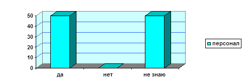 Рис. 11 - Мнение персонала о существовании в ТЦ «Элекам» определённого стиля, девиза и логотипа Таким образом, в ООО «Элекам», по мнению 50 % сотрудников, существует свой определённый, индивидуальный стиль, который и является фундаментом имиджа всей деятельности данной фирмы. При этом, половина персонала понятие не имеет, есть ли у фирмы свой стиль, девиз и логотип. Это говорит о том, что ведётся всё-таки недостаточная работа с персоналом по поддержанию имиджа фирмы. С целью выявления других необходимых элементов имиджа фирмы, был задан следующий вопрос: Есть ли у данной организации фирменные знаки, используемые в деловой переписке и т.д.?