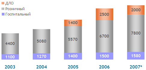 Рис.2 Динамика объема фармацевтического рынка России за 2003-2007 г.г. в ценах потребителя, млн. USD, вкл. НДС Прогноз на 2005-20012 годы показывает, что ожидается существенный рост рынка (рис.3).