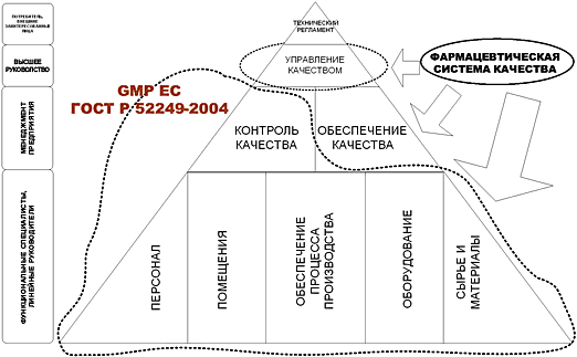 Рис.1 Классическая логистическая схема на фармацевтическом рынке доставляется от производителя в места продажи или потребления через одно или несколько складских звеньев посредников. Выбранные каналы товародвижения непосредственно влияю на скорость, время, сохранность и стоимость продукции при их доставке от производителя к конечному потребителю. Несмотря на то, что порой цепочка может быть достаточно длинной, конечный потребитель, т.е. население определенного региона, должен быть уверен, что покупает по-настоящему качественный продукт. Поэтому контроль качества должен осуществляться на каждом из звеньев. 2. Управление системой качества при производстве лекарственных средствОсновным фактором, вызвавшим пересмотр методологической базы в области управления качеством в настоящее время, стали инициативы FDA 2001-2002 гг., направленные на достижение качества готового продукта посредством в первую очередь организационных и управленческих мер, начиная с этапа разработки препарата. Следствием этой внутренней деятельности FDA стала активизация деятельности Международной конференции по гармонизации (ICH) в области нормативного обеспечения заявленных инициатив. Ставится задача достижения глобальной гармонизации в области требований к производству лекарственных средств по всем этапам жизненного цикла – разработка, опытное производство, производство – между регулирующими органами трех регионов, входящих в ICH: США, Япония, Европейское сообщество. Результатом работы исполнительного комитета ICH на данный момент стала разработка и принятие документов, относящихся к процессу создания ЛС (Q8 «Pharmaceutical Development»), управлению рисками качества (Q9 «Quality Risk Management») и системе качества (Q10 «Pharmaceutical Quality Systems»). Первые два документа приняты ICH и рекомендованы к применению национальным регулирующим органам на их территории. Последний документ – Q10 «Quality System» – вызвал более длительное обсуждение, в результате на данный момент существует только согласие членов ICH относительно структуры и методологической основы данного документа. В качестве основы для современной и эффективной системы качества организации – производителя ЛС приняты следующие документы: · ISO 9000: «Quality Management Systems» — fundamentals and vocabulary – существует гармонизированный ГОСТ Р 9000-2001 «Системы менеджмента качества. Основные положения и словарь»; · ISO 9001: 2000: «Quality Management Systems» — requirements – существует гармонизированный ГОСТ Р 9001-2001 «Системы менеджмента качества. Требования»; · ISO 9004: «Quality Management Systems» — guidelines for performance improvements – существует гармонизированный ГОСТ Р 9004-2001 «Системы менеджмента качества. Рекомендации по улучшению деятельности»; · Eudralex Volume 4: «Medicinal Product for Human and Veterinary Use: Good Manufacturing Practice» — существует национальный стандарт ГОСТ Р 52249-2004 «Производство и контроль качества лекарственных средств» (перевод GMP EC 2002 г.); · ICH Q7a: «Good Manufacturing Practice Guidance for Active Pharmaceutical Ingredients» — руководство «Правила надлежащего производства активных фармацевтических ингредиентов». Текст вошел в состав новой версии GMP EC от 3 октября 2005 г.; · US FDA: «Draft Guidance for Industry Concerning Quality Systems Approach to Pharmaceutical current Good Manufacturing Practice Regulations» — «Предварительное руководство для отрасли по системам качества применительно к фармацевтической текущей практике надлежащего производства»; · ISO 13485: 2003 Medical devices – Quality management systems; Requirements for regulatory purposes» 
