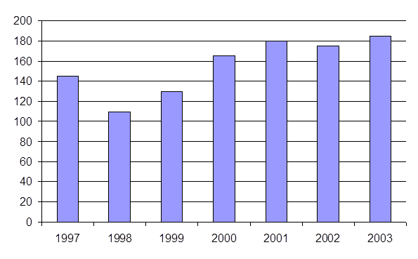 Исходя из данных таблицы, можно сказать, что прибыль до налогообложения выросла на 25%, объём реализации вырос на 16%, что является положительной тенденцией. Стоимость основных средств и стоимость оборотных средств увеличилась на 13% и 64% соответственно. Что свидетельствует о расширении производства. Стоимость производственных фондов выросла на 56% . Прибыль на 1 рубль реализованной продукции выросла на 8%, что очень хорошо для предприятия. Т.к. снизилась рентабельность производства на 2%, то это означает, что предприятие неэффективно использует основные и оборотные средства. Увеличение рентабельности продукции на 1% свидетельствует, что прибыль на каждый рубль выручки возросла. Рентабельность основной деятельности практически не изменилась. Общая рентабельность предприятия снизилась на 5% за счет неэффективного использования производственных фондов. Таким образом, анализ финансового состояния предприятия в целом свидетельствует об эффективной работе ООО «Телемакс». На предприятии наблюдается тенденция увеличения выручки от продаж, прибыли и повышение рентабельности. В связи с устойчивым положением ООО «Телемакс» и наличием свободных средств, создание нового магазина будет осуществляться за счет собственных средств ООО «Телемакс», без привлечения дополнительных инвестиций. Выводы:Анализ деятельности сети магазинов «Телемакс» позволяет сделать следующие выводы: 1. ООО «Телемакс» является торговым предприятием функционирующем на рынке сложной бытовой техники. 2. Результаты деятельности предприятия имеют положительную динамику, в частности чистая прибыль увеличилась за анализируемый период на 15,009 млн.руб. 3. Анализ показателей ликвидности, показал, что значение показателей имеют тенденцию к увеличению, и находятся в пределах нормативных значений, что свидетельствует об удовлетворительной платежеспособности. 4. Анализ показателей рентабельности свидетельствует об неэффективном использовании основных и оборотных средств. Раздел 2. Анализ рынка бытовой техники Санкт-Петербурга2.1. Тенденции развития рынка бытовой техники в Санкт-ПетербургеРынок магазинов бытовой техники характеризуется высоким уровнем конкуренции. Сегодня рынок бытовой техники является одним из динамично развивающихся рынков. Так по данным исследовательской фирмы «Гортис» в 2003 году уровень розничных продаж составил 175-195 тыс.долл., что значительно выше уровня 2002 года (рис. 2.1.).