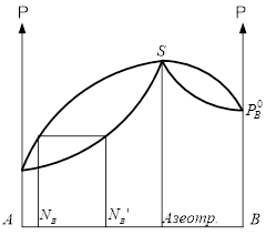 В случае совершенных растворов коэффициент разделения не зависит от состава Зависимость состава паровой фазы от температуры При повышении температуры пар равновесный с летучей смесью постоянного состава, обогащается тем компонентом, парциальная молярная теплота испарения которого больше. Этот закон справедлив для летучих смесей как без азеотропа, так и с азеотропом. В системе с макс. на кривой давления пара при повышении температуры в азеотропной смеси возрастает относительное содержание компонентов с большим парциальным молярной теплотой испарения, а в летучей смеси с мин. На кривой давления пара относительной содержание компонентов обратное. При повышении температуры в системе с макс на кривой давления пара состав равновесного пара и состав азеотропной смеси изменяется в одном направлении. В системе с мин состав равновесного пара и азеотропной смеси изменяется в противоположных направлениях.