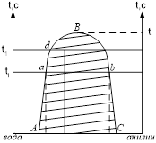Многие жидкости обладают ограниченной взаимной растворимостью и в некотором интервале температур и состав при их смешении образует 2 фазы. Например, анилин – вода: АВ – характеризует изменение растворимости анилина в воде с изменением температуры. ВС – характеризует изменение растворимости воды в анилине при изменение Т. АВ и ВС сходятся в точке В которая называется верхней критической температурой растворимости. Выше этой температуры объёмы жидкостей смешиваются в любых соотношениях. Если провести изотерму Давление насыщенного пара в системах с ограниченной взаимной растворимостью компонентов В подобных рассмотренных системах оба жидких слоя при равновесии обладают одинаковым паром (по общему давлению состава и по парциальному давлению компонента С).