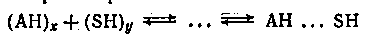 (предполагается для простоты, что молекулы растворителя также ассоциированы через Н-связь). .Впрочем, вряд ли было бы целесообразным считать любое межмолекулярное взаимодействие данного типа химическим. Так, если АН и SH — соединения тождественной химической природы, стоящие к тому же близко в гомологическом ряду (например, пропанол и бутанол, изомеры крезола, валериановая и масляная кислоты и т. п.), то образование новых межмолекулярных связей (перекрестных ассоциатов) не может быть отнесено к химическому взаимодействию, хотя бы потому, что это взаимодействие практически не сопряжено с таким изменением энергетических характеристик системы, которое могло бы быть с уверенностью зафиксировано. Выбор критерия, которым следует пользоваться для суждения о взаимодействии в химической системе, в каждый данный период развития химии зависит от развития теория, а также методов исследования химических систем. Так, в настоящее время благодаря интенсивному развитию ИК- и радиоспектроскопии, появляется возможность получения гораздо более интимных сведений о химической системе, чем два-три десятилетия назад. И несомненно, что спустя определенный промежуток времени появятся методы исследования, которые углубят степень познания процессов, протекающих в системе, столь же значительно, как это сделали упомянутые методы. Вот почему всегда, говоря о наличии или отсутствии химического взаимодействия, следует оговаривать, о какой степени приближения идет речь, так как очевидно, что универсального определения, одинаково пригодного для всех случаев, быть не может. Хотя современные методы исследования позволяют зафиксировать весьма слабые химические взаимодействия с энергией порядка десятой доли ккал/моль, в подавляющем большинстве случаев в растворах они не могут быть с уверенностью обнаружены. Дело в том, что энергетические эффекты смешения соизмеримы, а зачастую значительно превышают указанную величину. Вот почему слабая энергетика химического взаимодействия в растворах не может быть выделена на фоне значительных тепловых эффектов смешения, а также теплового движения молекул. В этих случаях предпочитают говорить'об отсутствии химического взаимодействия между компонентами, образующими раствор. Такая точка зрения является приближением, весьма пригодным для рассмотрения процессов, протекающих в растворах. Таким образом, процесс химического взаимодействия между растворенным веществом АК и растворителем S