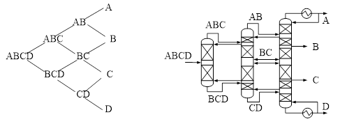 Рис.7. Суперструктура (а) и технологическая схема (б) разделения четырехкомпонентной смеси В продолжение метода автором [54,55] разработан систематический алгоритм перечисления всех возможных конфигураций технологических схем с полностью связанными тепловыми и материальными потоками, содержащих один кипятильник и один дефлегматор. Автором предложен ряд правил, с помощью которых происходит синтез суперструктуры: Вверху и внизу граничных ветвей всегда есть бинарная составляющая; Подгруппу, содержащую более трех компонентов, не следует подвергать четкому разделению на подгруппы, содержащие два и более компонентов; Каждая подгруппа имеет три линейных сегмента за исключением потоков питания и продуктов. Число различных конфигураций схем разделения j-компонентной смеси на чистые продукты определяется рекуррентным соотношением: