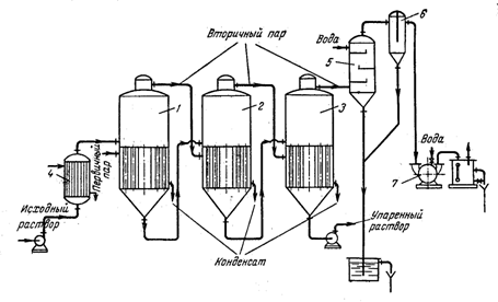 Рис. 1 - Многокорпусная прямоточная вакуум - выпарная установка: 1-3 – корпуса установки; 4 – подогреватель исходного раствора; 5 – барометрический конденсатор; 6 – ловушка; 7 – вакуум-насос