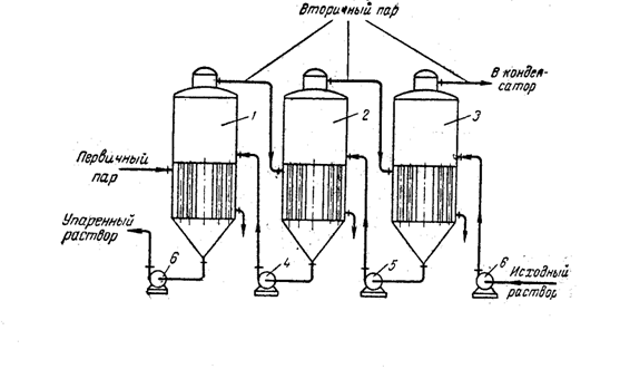 Рис. 2 - Многокорпусная противоточная выпарная установка: 1-3 – корпуса установки; 4-6 – насосы В химической промышленности применяются в основном непрерывно-действующие выпарные установки. Лишь в производствах малого масштаба, а также при выпаривании растворов до высоких конечных концентрации; иногда используют аппараты периодического действия. При периодической выпарке в аппарат загружают определенное количество раствора начальной концентрации, подогревают его до температуры кипения и выпаривают до заданной концентрации. Затем упаренный раствор удаляют из аппарата, вновь заполняют ею свежим раствором и процесс повторяют. Установки периодического действия обычно выполняются в виде отдельных аппаратов. Осуществить многоступенчатую выпарную установку с выпарными аппаратами периодического действия невозможно, так как не удастся согласовать режимы работы и производительность отдельных аппаратов. Применяемые схемы многокорпусных выпарных установок различаются по давлению вторичного пара в последнем корпусе. В соответствии с этим признаком установки делятся на работающие под разряжением, под избыточным и атмосферном давлениях. Выбор давления связан со свойствами выпариваемого раствора и возможностью использования тепла вторичного пара. Потребляя пар относительно высокого давления и многократно используя его теплосодержание для выпаривания воды из раствора, выпарные аппараты могут использовать почти все количество потребляемого вторичного пара в виде экстра-паров более низких давлений, отбираемых из отдельных корпусов, что происходит в многокорпусных аппаратов без всякого ущерба для основного процесса. Установки, в которых последняя ступень находится под некоторым избыточным давлением, называются выпарными установками с противодавлением Уменьшение давления вторичного пара последней ступени связано с уменьшением полезною перепада температур на установку, т.е. приводит к уменьшению кратности использования пара, что снижает экономические показатели. В выпарных установках под разряжением удается получить, возможно, больший перепад температур между паром, греющим первую ступень и вторичным паром последней ступени. Это позволяет применить наибольшую кратность использования пара в установке, но связано с лотерей тепла со вторичным паром последней ступени, который из выпарной установки направляется непосредственно в конденсатор. Используются и выпарные установки с ухудшенным вакуумом. В этих схемам предусматривается частичное использование вторичного пара последней ступени для покрытия тепловой нагрузки низкого потенциала, остальная часть пара направляется в конденсатор. При выпаривании под вакуумом температура кипения снижается; эго обстоятельство используется при сгущении растворов, для которых. во избежание порчи продукта, нельзя допустить высоких температур кипения. При выпаривании под атмосферным давлением (проводят в однокорпусных выпарных установках) вторичный пар используется и обычно удаляется в атмосферу. Такой способ выпаривания является наиболее простым, но наименее экономичным. Экономия вторичного пара может быть также достигнута в однокорпусных выпарных установках с тепловым насосом. В таких установках вторичный пар на выходе из аппарата сжимается с помощью теплово