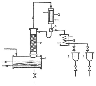 Рис. 1.7. Схема установки для азеотропной ректификации: 1 – колонна; 2 – конденсатор; 3 – отстойник; 4 – кипятильник Наиболее сложной задачей при использовании методов экстрактивной и азеотропной ректификации является выбор разделяющего компонента, который должен удовлетворять следующим требованиям: 1)обеспечивать, возможно, большее повышение коэффициента относительной летучести разделяемых компонентов; 2)достаточно легко регенерировать; 3)хорошо растворять разделяемые компоненты для предотвращения расслаивания жидкой фазы при температурных условиях в колонне; 4)быть безопасным в обращении, доступным, дешевым, термически стабильным. Обычно при выборе разделяющего агента основываются на справочных данных. Методы азеотропной и экстрактивной ректификации находят широкое применение для разделения близкокипящих углеводородов нефти и сжиженных природных газов, жидких смесей в производстве жирных кислот, получения безводного этилового спирта и др. 1.3. Типовое оборудование для проектируемой установкиДля проведения процессов ректификации применяются аппараты разнообразных конструкций, основные типы которых не отличаются от соответствующих типов абсорберов. В ректификационных установках используют главным образом аппараты двух типов: насадочные и тарельчатые ректификационные колонны. Кроме того, для ректификации под вакуумом применяют пленочные и роторные колонны различных конструкций. Насадочные, барботажные, а также некоторые пленочные колонны по конструкции внутренних устройств (тарелок, насадочных тел и т. д.) аналогичны абсорбционным колоннам. Однако в отличие от абсорберов ректификационные колонны снабжены теплообменными устройствами – кипятильником (кубом) и дефлегматором. Кроме того, для уменьшения потерь тепла в окружающую среду ректификационные аппараты покрывают тепловой изоляцией. Кипятильник или куб, предназначен для превращения в пар части жидкости, стекающей из колонны, и подвода пара в ее нижнюю часть (под насадку или нижнюю тарелку). Кипятильники имеют поверхность нагрева в виде змеевика или представляют собой кожухотрубчатый теплообменник, встроенный в нижнюю часть колонны (см. рис. 1.8). Более удобны для ремонта и замены выносные кипятильники, которые устанавливают ниже колонны с тем, чтобы обеспечить естественную циркуляцию жидкости.