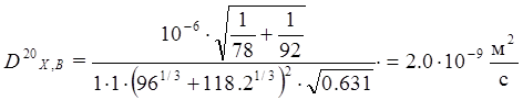 Коэффициент диффузии в жидкости при температуре t=200 C в верхней и нижней частях колонны: а) в верхней части колонны:
