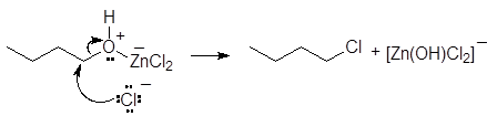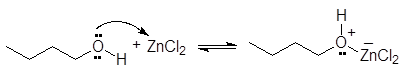 Упр.10. При нагревании 3-метил-2-бутанола, насыщенного газообразным бромоводородом, в качестве единственного продукта реакции образуется 2-бром-2-метилбутан. Напишите эту реакцию и опишите ее механизм. Упр.11. При взаимодействии неопентилового спирта с бромоводородом в качестве единственного продукта реакции образуется 2-бром-2-метилбутан. Напишите эту реакцию и опишите ее механизм. Для получения алкилхлоридов при взаимодействии первичных спиртов с соляной кислотой используют катализатор - безводный хлорид цинка. Хлорид цинка как жесткая кислота Льюиса координируется по атому кислорода, облегчая тем самым замещение гидроксильной группы: