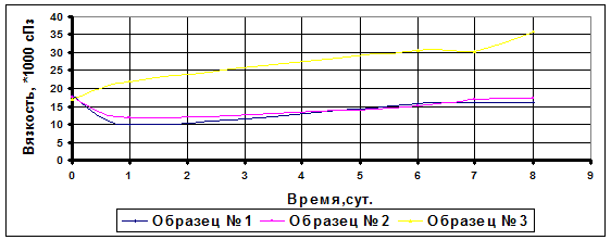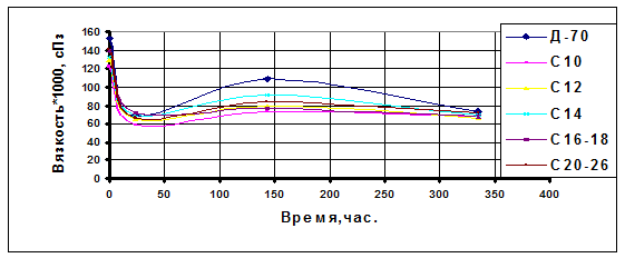 Из проделанных далее опытов (рис.7,8) видно, что наиболее оптимальными свойствами обладает ПВХ-пластизоль, в составе которых присутствует а-олефины с углеродной цепочкой С14, С16-18, С20-26, так как она имеет наиболее стабильные свойства во времени.