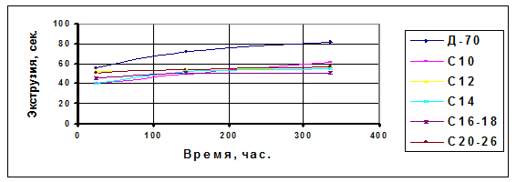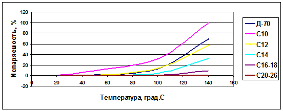 Высокая вязкость не позволяет ПВХ-пластизоли этого состава стекать с кузова автомобиля, а низкая экструзия обусловливает легкое перемещение по трубопроводам технологической системы нанесения пластизоли. Исследованы рецептуры, в составе которых использовался разбавитель керосинового типа различной молекулярной массы отечественного производства (a-олефины с углеродным скелетом С10, С12, С14, С16-18, С20-26) и зарубежный аналог под маркой Д-70. Испытание на испарение (рис.6) данных веществ показало, что близким аналогом зарубежного разбавителя является а-олефины с углеродной цепочкой С12.