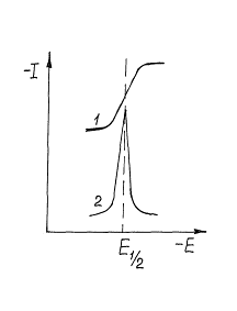 Рис. 4. Интегральная (1) и дифференциальная (2) полярограммы. В дифференциальной полярографии чувствительность и селективность классической полярографии можно повысить, если регистрировать зависимость от потенциала не тока, а его производной от потенциала (dI/dE). В этом случае вместо полярографической волны получают кривую с максимумом (рис.2.14.3). Потенциал максимума соответствует потенциалу полуволны обычной полярограммы, а высота максимума пропорциональна концентрации исследуемого вещества. Сигнал, пропорциональный производной тока от потенциала, формируется в полярографе с помощью сравнительно простой электрической схемы. Для увеличения отношения полного сигнала (фарадеевский ток) к фону (ток заряжения) можно воспользоваться разной временной зависимостью фарадеевского тока Iф и тока заряжения Iз при росте ртутной капли. Установлено, что Iф растет во времени пропорционально t1/6, а ток заряжения падает пропорционально t-1/3. Таким образом, при отрыве капли соотношение Iф к Iз максимально и условия измерения наиболее благоприятны. В методе так называемой таст-полярографии (от нем. tasten - зондировать) измерения тока проводят не непосредственно во время “ жизни “ капли, а только в течение короткого времени - 5...20 мс - перед отрывом капли. Этим способом удается чувствительность метода увеличить на порядок, т.е. до (1...5) 10-6 моль/л. Амперометрическое титрование - это метод анализа, возникший на основе классической полярографии. В нем предельный диффузионный ток используют для нахождения точки эквивалентности при проведении титрования. Амперометрическое титрование возможно только при условии электроактивности (способности разряжаться на электроде) определяемого вещества или вещества титранта или хотя бы одного продукта их реакции. Для проведения амперометрического титрования аликвотную часть анализируемого раствора помещают в электролизер. В раствор опускают РКЭ или твердый (чаще всего платиновый) микроэлектрод и электрод сравнения. На электроды подают напряжение, отвечающее области предельного тока электроактивного вещества, и проводят титрование. После добавления из бюретки каждой отдельной порции титранта отмечают силу тока. Пусть электроактивным является определяемое вещество, например, Pb2+, тогда добавление титранта (H2SO4), реагирующего с ним, будет уменьшать концентрацию определяемого вещества в растворе, в соответствии с этим будет уменьшаться и предельный диффузионный ток.