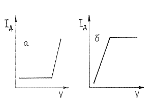 Рис. 6. Кривые амперометрического титрования при электроактивном титранте (а) или продукта реакции титрования (б). Для амперометрического титрования пригодны реакции комплексообразования, осаждения, а также редоксиреакции. Концентрация титруемого раствора обычно порядка 10-3 моль/л. Определять можно не только неорганические, но и органические вещества (например, фенолы). Метод значительно проще, экспресснее и доступнее полярографии и вольтам перометрии. Инверсионная вольтамперометрия (вольтамперометрия с накоплением) - это метод, отличающийся от других не формой используемого импульса, а принципом проведения анализа. Исследуемое вещество сначала частично или полностью осаждают электрохимическим путем из пробы раствора на инертный электрод-подложку (стадия накопления, концентрирования). Чаще всего этот метод применяют для катионов металлов, которые катодно осаждают на стационарном (не капающем!) ртутном электроде или на платиновых, золотых, графитовых и т.д. твердых индифферентных электродах. На второй стадии, после извлечения ионов из раствора, электрод с пленкой осажденного металла подвергают анодной поляризации с линейно изменяющимся (с постоянной скоростью) потенциалом. При превышении в ходе поляризации равновесного значения потенциала, отвечающего определяемому металлу, он начинает растворяться, причем тем активнее, чем больше поляризующее напряжение. Соответственно с этим растет регистрируемый самописцем-потенциометром ток растворения. Выходная кривая (вольтамперограмма) данного метода имеет вид кривой с максимумом, отвечающим окончанию растворения концентрата и выходу фронта растворения на поверхность индифферентного электрода (рис.2.14.6).