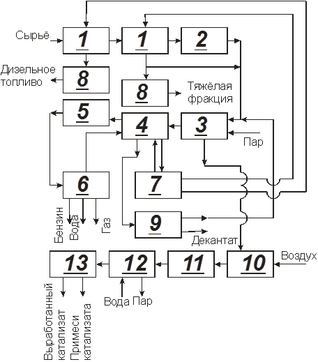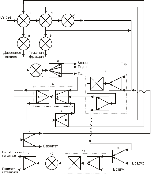 1 — теплообменники, 2 — трубчатая печь, 3 — реактор «КС», 4 — ректификационная колонна, 5 — холодильник-конденсатор, 6 — газоотделитель, 7 — отпарнаа колонна, 8 — холодильники, 9 — шламоотделитель, 10 — узел смешения, 11 — регенератор катализатора «КС», 12 — котел-утилизатор, 13 — электрофильтр. Сырье через теплообменники 1 подается в печь 2. Нагретое сырье смешивается с рециркулятом поступает в реактор крекинга 3. В нижнюю отпарную зону реактора вводится водяной пар для отдувки катализатора. Пары продуктов реакции и водяной пар из верхней части реактора 3 поступают в нижнюю часть ректификационной колонны 4. Пары бензина и водяной пар отбираются с верхней части колонны, проходят холодильник-конденсатор 5 и поступают в сепаратор 6, в котором разделяются на водяной слой, бензиновый слой и газ. Газ компрессируется и подается на газофракционирование, а бензин поступает на ректификацию. Часть бензина отбирается на орошение колонны. Дизельное топливо и тяжелая фракция проходят через секции отпарной колонны 7, охлаждаются в теплообменниках 1 и холодильниках 8 и отводятся как товарные продукты. Часть тяжелой фракции в виде рециркулята смешивается с сырьем и подается в реактор 3, а часть направляется на орошение нижней части колонны 4. Смесь тяжелых жидких продуктов крекинга и катализаторной пыли из низа колонны 4 поступает в шламоотделитель 9, из которого шлам возвращается в реактор 3, а богатый ароматическими углеводородами декантат отводится с установки. Дезактивированный в процессе работы катализатор из кипящего слоя реактора опускается в его отпарную зону и катализаторопроводом отводится в узел смешения с воздухом 10. Из него за счет воздушного потока катализатор переносится в регенератор 11, в котором создается кипящий слой. Основная часть воздуха для выжигания катализатора подается непосредственно в регенератор. Газы, образовавшиеся в результате выжигания кокса, проходят котел-утилизатор 12, электрофильтр 13 для улавливания катализаторной пыли и выбрасываются в атмосферу. Регенерированный катализатор из нижней части регенератора 11 поступает в катализаторопровод и вместе с сырьем и рециркулятом возвращается в реактор 3. 5. Анализ ХТС