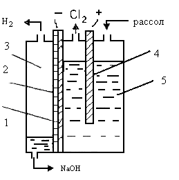 Рис. 2. Электролизер вертикального типа: 1 – перфорированный катод, 2 – диафрагма, 3 – катодное пространство, 4 – анод, 5 – анодное пространство. Электролизер состоит из герметически закрытого корпуса, что исключает подсос воздуха и загрязнение им газообразных продуктов электролиза, анода, катода и диафрагмы. Он снабжен устройствами для подвода рассола и отвода щелока, хлора и водорода. Катод Таблица 2Характеристики электролизеров с железным катодом и металлооксидными анодами