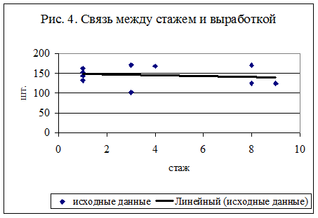 Интерпретация полученного уравнения связи: Коэффициент регрессии а1 = - 1,03267, следовательно, связь между стажем и выработкой в данной совокупности обратная: при увеличении стажа на 1 год выработка снижается на 1,03267 шт. Степень тесноты связи в случае линейной зависимости определяется с помощью линейного коэффициента корреляции: