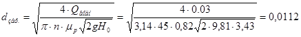 де: hо - висота шару піску в лотку до подачі промивної води, згідно [8], ст. 56 hо = 0,2 м. Діаметр отворів збризкувачів знайдемо за формулою: