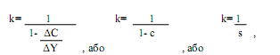 ΔI ; де: k – мультиплікатор інвестицій; ΔY – приріст національного доходу; ΔІ – приріст інвестицій. Зробивши відповідні перетворення можна вивести залежність величини мультиплікатора інвестицій від рівня граничної схильності до споживання і граничної схильності до заощаджень.