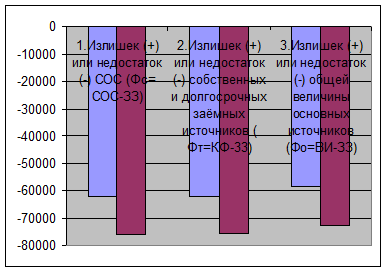Рисунок 2 Динамика излишка (недостатка) капитала 1. Недостаток СОС На начало года: -49664 – 12524 = - 62188 На конец года: -60472 – 15388 = - 75860 2. Излишек (недостаток) функционирующего капитала На начало года: -49588 – 12524 = - 62112 На конец года: -60371 – 15388 = - 75759 3. Излишек (недостаток) капитала На начало года: -49588 – 12524 = - 62112 На конец года: -57311 – 15388 = - 72699 То есть не одного из вышеперечисленных источников не хватало ни на начало, ни на конец года. 6. Анализ и диагностика обязательств предприятияАнализ обязательств предприятия приведен в табл.