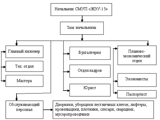 Рисунок 0.1. Организационно-производственная структура СМУП «ЖЭУ-15» Функции административного и обслуживающего персонала организации включают: руководство деятельностью предприятия в соответствии с действующим законодательством РФ и согласно утвержденному уставу; организацию и ведение учета бухгалтерского учета в соответствии с едиными методологическими основами бухгалтерского учета и отчетности; планирование финансово-хозяйственной деятельности организацию труда и заработной платы работников предприятия; обеспечение кадрами требуемой квалификации и специальности; организацию учебно-методической работы по повышению квалификации работников предприятия; документальное оформление управленческих решений, действий, связей; организацию документооборота; упорядочение и хранение документации; контроль своевременного исполнения приказов, поручений; обеспечение предприятия всеми необходимыми для его деятельности материальными ресурсами; прием, хранение и отпуск товарно-материальных ценностей; контроль за их использование; контроль за их использованием; хозяйственное обслуживание зданий и помещений в соответствии с правилами производственной санитарии и пожарной безопасности. В перечень должностей административного и обслуживающего персонала СМУП «ЖЭУ-15» входят: начальник, заместитель начальника, главный инженер, главный бухгалтер, начальники отделов, заведующий хозяйством, бухгалтер, кассир, юрисконсульт, инспектор по кадрам, инженер по технике безопасности. Для того чтобы иметь представление о результатах финансово-экономической деятельности СМУП «ЖЭУ-15» необходимо рассмотреть некоторые показатели. К важнейшим показателям, характеризующим результаты производственной деятельности предприятия и его структурных подразделений следует отнести: среднесписочную численность работников, объем работ, услуг, себестоимость работ, услуг, затраты организации, прибыль (убыток). Первый показатель, который будет рассмотрен, это показатель среднесписочной численности работников предприятия, который предназначен для контроля изменения численности работников. В среднесписочный состав включаются все работники предприятия, принятые на постоянную сезонную, а также временную работу на срок один день и более со дня зачисления на работу. Среднесписочная численность – это среднее значение количества работников, числящихся на предприятии по списку за определенный период времени (месяц, квартал, 6 месяцев, 9 месяцев, год). В данном случае в таблице 0.1. среднесписочная численность работников предприятия представлена за год. Расчет среднесписочной численности работников производится по формуле: 0.1: