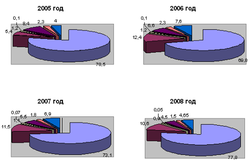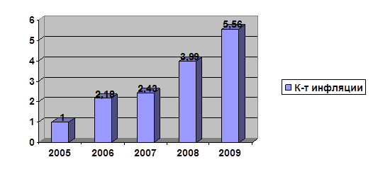На рисунке 0.5 представлена динамика средневзвешенного коэффициента инфляции. Из рисунка 0.5 можно сделать вывод о том, что темпы роста инфляции с каждым годом увеличивались. Лишь в 2007 году по сравнению с 2006 годом инфляция возросла незначительно на 0,25 %. Средневзвешенный коэффициент инфляции вырос за пять лет в 5,56 раз, что означает увеличение тарифов.