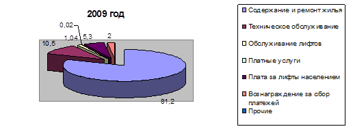 Данные таблицы 0.2 свидетельствуют о том, что объем выполненных работ, оказанных услуг, начиная с 2005 по 2009 год, увеличился на 7108,9 тыс. руб. Плата за содержание и ремонт жилья в течение 5 лет возросла на 5825,1 тыс. руб. Выручка от обслуживания лифтов за период с 2005 года по 2008 год постоянно росла, а в 2009 году резко сократилась, что является негативным фактором. В 2009 году плата за прочие услуги отсутствовала. Плата населения за лифты возросла в течение пяти лет почти втрое, что объясняется ростом тарифов. Техническое обслуживание в течение пяти лет выросло почти в 9 раз. Структура выполненных работ, оказанных услуг представлена на рисунке 0.4. Рисунок показывает, что наибольший удельный вес в структуре объема выполненных работ, оказанных услуг занимает плата за содержание и ремонт жилья. За 5 лет доля этого показателя выросла на 2,7 %. Наименьший удельный вес в структуре занимают платные услуги, их доля колеблется в пределах от 0,02 % до 0,1 %, в 2005 и 2006 годах доли платных услуг равны и составляют по 0,1 %, а с 2007 года по 2009 год они снижаются до 0,02 %.