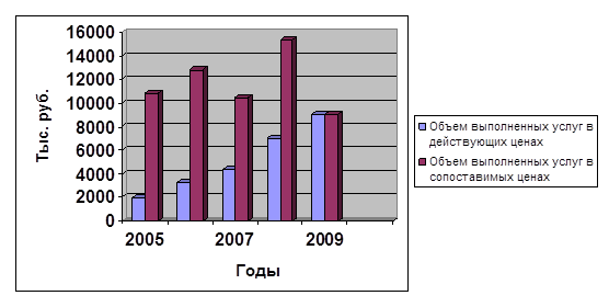 Рисунок 0.5. Динамика средневзвешенного коэффициента инфляции за 2005-2009 гг. На основе рассчитанных коэффициентов инфляции можно рассчитать объем выполненных работ, оказанных услуг в сопоставимых ценах. Расчет представлен в таблице 0.7. Из таблицы видно, что наиболее существенное влияние оказывает увеличение цен, а следовательно и, рост коэффициента инфляции оказал на объем выполненных работ, оказанных услуг в 2006 и 2008 годах. Таблица 0.7 Расчет объема выполненных работ, оказанных услуг сопоставимых ценах за 2005-2009 гг.