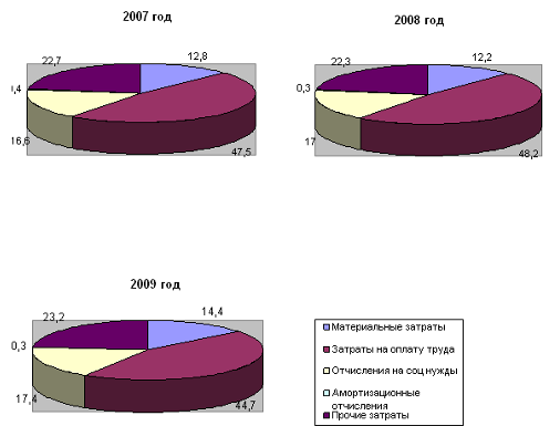Рисунок 0.6. Динамика объема выполненных работ, услуг в действующих и сопоставимых ценах за 2005-2009 гг. Выпуск продукции, выполнение работ, оказание услуг предполагает соотношение затрат ресурсов, величина которых оказывает существенное влияние на уровень развития экономики предприятия. Поэтому каждая организация должна знать, во что обходится ему производство продукции, выполнение работ, оказание услуг. Показателем, характеризующим технико-экономический уровень производства и его конкурентоспособность, является себестоимость. Затраты – это денежное выражение трудовых, материальных и финансовых ресурсов, необходимых для осуществления предприятием деятельности, связанной с выполнением работ, оказанием услуг. В соответствии с ПБУ 10/99 «Расходы организации» также принято затраты группировать по экономическим элементам. Затраты на выполнение работ и оказание услуг определяются по формуле 0.5: С = М + Зраб + О + А + Рпроч , (0.5) где: М – материальные затраты в себестоимости оказанных услуг, Зраб – затраты на оплату труда, О – отчисления на социальные нужды, А – амортизация, Рпроч – прочие расходы. Таблица 0.8. Динамика и структура затрат СМУП «ЖЭУ-15» за 2005-2009 гг. по экономическим элементам (тыс. руб, %)