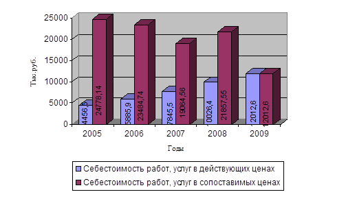 Рисунок 0.7. Структура затрат СМУП «ЖЭУ-15» за 2005-2009 гг. При анализе рисунка можно увидеть, что наибольший удельный вес на протяжении пяти лет в группировке затрат по экономическим элементам занимают затраты на оплату труда и составляют практически 50 % от общей суммы затрат. Следовательно, можно сказать о том, что производство СМУП «ЖЭУ-15» является трудоемким. Себестоимость — это стоимостная оценка используемых в процессе оказания услуг, выполнения работ природных ресурсов, сырья, материалов, топлива, энергии, основных фондов, трудовых ресурсов. Таблица 0.9. Динамика себестоимости работ, услуг СМУП «ЖЭУ-15» за 2005-2009 гг. в действующих и сопоставимых ценах.