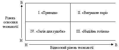 Рис.4. Портфель технологій (розробка фірми "Сімена") Таблиця 2. Зв'язок загальних конкурентних стратегій та стратегій у галузі досліджень і розробок у формуванні конкурентних переваг