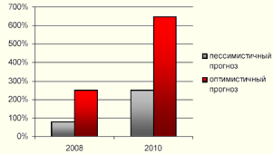 Рис.8. Прогноз развития рынка лизинга к 2008г. при условии решения правовых проблем Среди значимых изменений в законодательстве для лизинговых компаний в 2006 году можно отметить следующие два: включение статьи «Доходные вложения в материальные ценности» в состав основных средств для бухгалтерского учета, что привело к обложению объектов лизинга налогом на имущество и, как следствие, отразилось на общей стоимости договоров лизинга; и изменения в Налоговом кодексе РФ, касающиеся определения налоговой базы по НДС: с 1 января 2006 года - только по отгрузке. Решение наиболее насущных проблем рынка могло бы в течение ближайших 4 лет привести к росту рынка в 5-7 раз. В случае, если проблемы решены не будут, рынок вырастет максимум в 2,5-3 раза (рис.9).