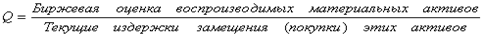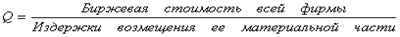 Если дробь больше единицы, то инвестирование выгодно. Причем чем больше, тем выгоднее. Так, рост рыночной (биржевой) оценки домов по отношению к текущей стоимости их строительства стимулирует жилищное строительство, поскольку рыночная цена больше, чем текущие издержки замещения данного дома на новый. Таким образом, выгодность инвестирования привязывается к соотношению между ценой спроса и ценой предложения. Так, в случае инвестирования в покупку целого предприятия (фирмы) определяем: