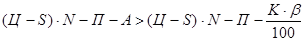 де: Ц - середня ціна одиниці продукції, яка буде випускатись на орендованому підприємстві, грн.; S - середня виробнича собівартість одиниці продукції, яка буде випускатись на орендованому підприємстві, грн.; N - кількість товарів (обсяг продукції"), які будуть виготовлятись на орендованому підприємстві за рік, шт.; П - величина всіх податків та комунальних платежів, які повинен сплачувати орендар, грн. А - величина орендної плати, яку буде сплачувати орендар за рік, грн.; К - величина кредиту, який орендар повинен взяти в комерційному банку для початку своєї справи, грн. Величина К повинна дорівнювати вартості майнового комплексу, (підприємства), який планується взяти в оренду, грн.;