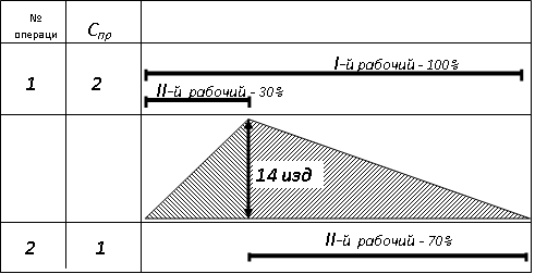 Принятое количество рабочих мест получается путем округления до большего целого. Коэффициент загрузки определяется также как и для НПЛ. Определение числа работающих По причине непропорциональности технологического процесса в ППЛ всегда есть рабочие места с малым коэффициентом загрузки, поэтому количество работающих определяется учетом совмещенного обслуживания малозагруженных рабочих мест на разных операциях. Пример: Дано: