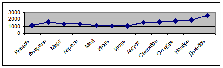 Очевидно, что данная система наиболее оптимально соответствует гибкой маркетинговой политики предприятия в разрезе товарных групп, пользующихся интересом у потребителя в зависимости от новизны, дизайна, цены, условий акции. 10) Построить график движения материального запаса за определенный период (декаду, месяц, квартал). Объяснить причину колебаний запасовВсе товары, предлагаемые в супермаркете различны, величины их запасов колеблются в зависимости от спроса, сезонных колебаний, поэтому рассмотрим график движения материального запаса по одной товарной группе, а именно телевизоры с диагональю 54 см. Спрос на данный товар подвержен сезонным колебаниям (наиболее востребована данная группа в осенне-зимний период), поэтому график материального потока данной группы выглядит следующим образом (рис.4).