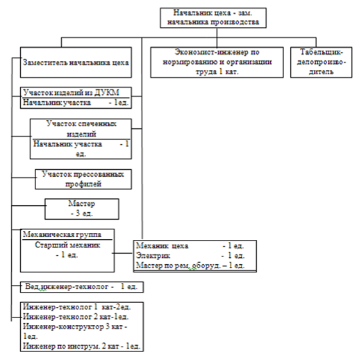 Структура и штаты цеха утверждает генеральный директор ОАО «Уралэлектромедь» в соответствии с действующими нормативами численности руководителей, специалистов и служащих с учетом объемов работы и особенностей производства. Организационная структура ЦППИ представлена в виде схемы 1. Режим работы цеха трехсменный с двумя выходными днями. По этому графику работает участок спеченных изделий с эффективным годовым фондом работы оборудования 5310 часов, причем спекания печи работает по непрерывному графику с годовым фондом работы оборудования 7710 часов. Численность трудящихся: по цеху – 93 чел, в том числе основной технологический персонал – 61 чел; вспомогательный персонал 17 чел; руководители и специалисты –17 чел. В ЦППИ используются два прогрессивных процесса производства (для изготовления спеченных изделий и изделий из дисперсно-упрочненных композиционных материалов (ДУКМ)). Первый, основанный на традиционной технологии изготовления прессованных спеченных изделий, обеспечивает экономическую эффективность и конкурентоспособность продукции за счет высокой степени использования материала, точности размеров и форм, что практически полностью исключает необходимость дальнейшей механической доработки деталей. Схема 1. Организационная структура управления цеха по производству порошковых изделий