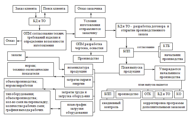 После заключения договора БД и ТО открывает производственный заказ в бюро подготовки производства (БПП) (Форма 1) до 20 числа текущего месяца. Производственный заказ включает в себя два периода. Например, производственный заказ на март, апрель; на апрель, май и т.д.Заказ согласовывается с конструкторско-технологическим бюро, утверждается начальником производства. На основании плана выпуска продукции на периоды (квартал, месяц) и производственных заказов не позднее 22-го числа месяца, предшествующего плановому, БПП разрабатывает: Перечень номенклатуры продукции, изготавливаемой в следующем месяце по участкам (Форма 2); Плановые показатели на выпуск продукции по затратам сырья, энергии (Форма 3). Инженеры-технологи рассчитывают нормы расхода материала, основываясь на фактических данных. Если в планируемом периоде будет производится уже освоенная деталь, то используют эти (уже рассчитанные) нормы расхода, если деталь новая, то технологи выдают примерные нормы расхода. Расход электроэнергии, газа, отходы и потери производства берутся из технико-экономических показателей ЦППИ на квартал. Технико-экономические показатели рассчитываются по участкам на 1 кг. изделий (для производства гранул дисперсно-упрочненной меди расход рассчитывается на тонну гранул). Показатели утверждаются главным инженером АР «Уралэлектромедь»; Плановые показатели на выпуск продукции по затратам труда и загрузке оборудования (Форма 4). Эти плановые показатели основываются на нормах выработки. Для определения трудозатрат, объем производства (шт.) делится на норму выработки (шт. в смену). Т. о. Определяется количество человеко-смен по каждому оборудованию, затем они (человеко-смены) суммируются для определения общего количества человеко-смен, необходимых для полного цикла изготовления изделия. Вычисление этих показателей важно для правильного составления плана-графика загрузки оборудования; На основании перечня продукции, норм трудоемкости на производство порошковых изделий, утвержденных начальником ППИ, БПП разрабатывает план-график загрузки оборудования на месяц (Форма 5). План-график загрузки оборудования является основным документом, по которому работают начальники участков. Для составления плана-графика необходимы следующие данные: тип оборудования. Он определяется исходя из имеющегося парка оборудования, в соответствии с требованиями технологического процесса. объем производства. Определяется в соответствии с производственными заказами. количество смен, необходимых для каждой операции (из Формы 4). количество смен, необходимых для переналадки оборудования. график выхода на работу. При составлении плана-графика загрузки оборудования необходимо учитывать численность работников в смене для предоставления им необходимого количества рабочих мест. График выхода на работу разрабатывается на год отделом по работе с персоналом (для всего предприятия), согласовывается с профкомом и утверждается генеральным директором ОАО «Уралэлектромедь». начальник участка каждый месяц предоставляет график выхода в БПП в соответствии с количеством имеющихся на участке работников. В Форме плана-графика загрузки оборудования в верхней строчке пишется наименование детали, операция (к – калибрование, п – прессование) и количество (шт.) Разработанные БПП до