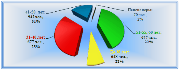 Рисунок 1 – Диаграмма распределения качественного состава работающих на 1.01.2009 г. На предприятии наибольшую долю занимают работники в возрасте от 41 до 50 лет. В последние годы наблюдается тенденция увеличения доли работников в возрасте 31-40 лет. В дальнейшем это может сказаться положительно на эффективности работы предприятия, так как 31-49 летние работники – это люди с высокой степенью квалификации, с продолжительным стажем и опытом работы. Структура кадров предприятия в возрастном разрезе изображена на рисунке 2.