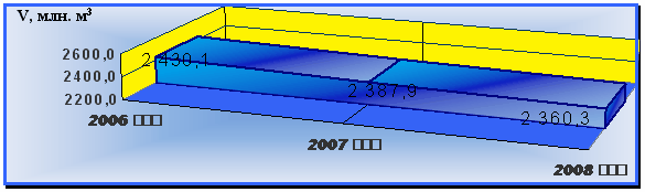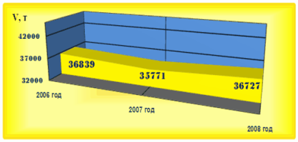 Рисунок 3 - Динамика объёма реализации природного газа За 2007 год реализовано 2387,9 млн. м3 природного газа, что на 2429,2 млн. м3 или на 1,7 % меньше, чем за 2006 год. За 2008 год объём реализации природного газа снизился в сравнении с показателем 2007 года на 27,6 млн. м3 или на 1,2 % и составил 2360,3 млн. м3. Объёмы реализации сжиженного газа в анализируемом периоде в натуральном выражении сохранились на уровне объёмов 2006 года, а выручка увеличились на 54 %. За 2008 г. реализовано 36727 т сжиженного газа, что составляет 95,7 % к 2007 г. Динамика объёма СГ изображена на рисунке 4.