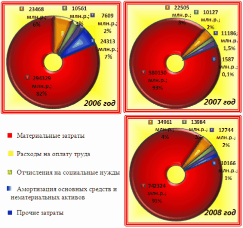 Согласно данных таблицы 5, себестоимость реализованной продукции на протяжении анализируемых лет неуклонно растет. В 2007 г. по отношению к 2006 г. себестоимость возросла на 276116 млн. р. или на 76 %, в 2008 г. относительно к предшествующему ему году - на 184216 млн. р. или на 28 %. Для более наглядного представления структуры себестоимости на рисунке 7 представлены ее составные части в виде гистограммы в анализируемых периодах.