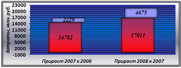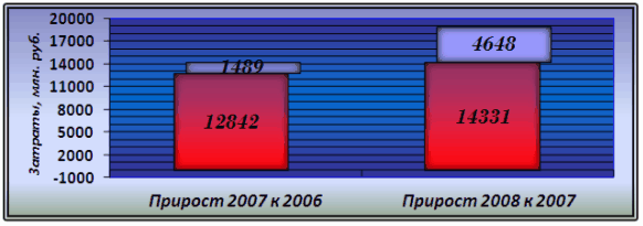 Исходя из данных таблицы 12, в 2006, 2007 и 2008 годах происходили следующие изменения затрат по содержанию и эксплуатации системы распределения природного газа: — в 2007 г. к 2006 года: возрастание на 1489 млн. р. или на 11,6 %; — в 2008 г. к 2007 года: возрастание на 4648 млн. р. или на 27,5 %; Наибольшее возрастание затрат произошло за счёт увеличения затрат: - транспортных расходов по доставке газа абонентам (на 18 % в 2008 г. к 2007 г.); - на содержание и ремонт газонаполнительной станции, АГЗС и баллонов (на 30 % в 2007 г. к 2006 г., на 38 % в 2008 г. к 2007 г.); - содержание резервуарных установок и газопроводов (на 23 % в 2008 г. к 2007 г.); - содержание внутренних газопроводов и газового оборудования (на 24 % в 2008 г. к 2007 г.); - содержание аварийной службы (на 5 % в 2007 г. к 2006 г., на 37 % в 2008 г. к 2007 г.).