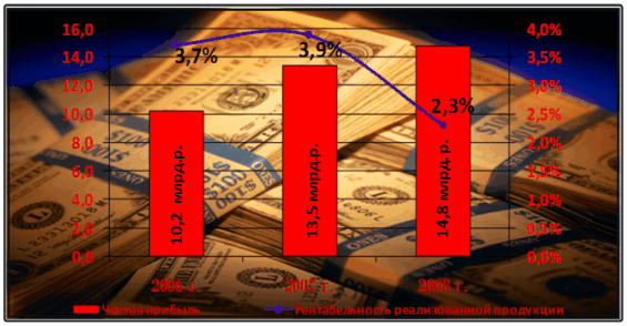 Рисунок 12 – Распределение чистой прибыли Чистый доход предприятия является положительным. В 2007 г. он составил 37799 млн. р., что на 8308 млн. р. (или на 28 %) больше уровня 2006 г., и на 4573 млн. р. меньше последующего. Чистая прибыль предприятия и амортизационные отчисления являются по существу тем главным финансовым ресурсом, который определяет его экономический потенциал и способность к самофинансированию. Именно прибыль является главным источником расширения производства и наращивания производственного потенциала, источником дополнительного материального стимулирования работников. Анализ рентабельности реализованной продукции. Рентабельность в отличие от прибыли предприятия, показывающей эффект предпринимательской деятельности, характеризует эффективность этой деятельности. Рентабельность - относительная величина, выражающая прибыльность (доходность) предприятия. Показатели рентабельности применяют для оценки деятельности предприятий и как инструмент в инвестиционной политике и ценообразовании. В рыночной экономике существует система показателей рентабельности. Рентабельность продукции можно рассчитать как по всей реализованной продукции, так и по отдельным ее видам. Рентабельность всей реализованной продукции можно определить как процентное отношение: прибыли от реализации продукции к затратам на ее производство и реализацию; прибыли от реализации продукции к выручке от реализованной продукции; балансовой прибыли к выручке от реализации продукции; чистой прибыли к выручке от реализации продукции. Эти показатели дают представление об эффективности текущих затрат предприятия и степени доходности реализуемой продукции. Рентабельность отдельных видов продукции зависит от цены и полной себестоимости. Она определяется как процентное отношение цены реализации единицы данной продукции за вычетом ее полной себестоимости к полной себестоимости единицы данной продукции. Показатели рентабельности реализованной продукции см. в таблице 12. Согласно данным таблицы, каждый рубль затрат на производство и сбыт продукции в 2007 г. принес предприятию прибыль 3,72 коп., это в 1,05 раза больше, чем в предшествующем 2006 г. В 2008 г. прибыль упала до 2,31 коп. Влияние на рентабельность реализованной продукции таких факторов, как изменение объёма реализованной продукции и средних цен реализации изделий следует рассчитывать как отношение суммы влияний каждого из названных факторов на прибыль от реализации продукции к себестоимости реализованной продукции базового года: