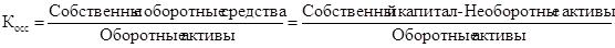 Основными причинами снижения коэффициента обеспеченности финансовых обязательств активами в 2006-2008 гг. являются: 1) снижение долгосрочных и краткосрочных обязательств: а) в 2007 г. к 2006 г. – на 11 % с 55713 млн. р. до 49963 млн. р.; б) в 2008 г. к 2007 г. – на 4 % с 49963 млн. р. до 47810 млн. р. 2) увеличение валюты баланса предприятия: а) в 2007 г. к 2006 г. – на 19 % с 265301 млн. р. до 316701 млн. р.; б) в 2008 г. к 2007 г. – на 7,8 % с 316701 млн. р. до 341502 млн. р. Коэффициент обеспеченности собственными оборотными средствами Косс характеризует наличие у предприятия собственных оборотных средств, необходимых для его финансовой устойчивости и определяется по формуле
